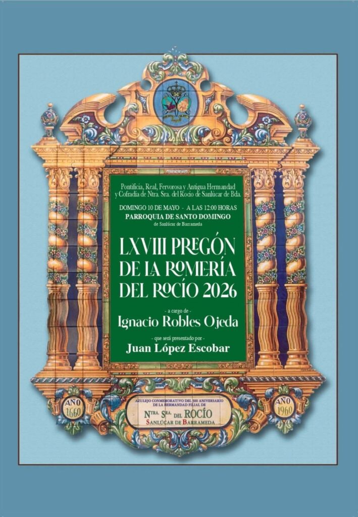 El próximo domingo, 10 de mayo, a las 12:00 horas, nos reuniremos en la parroquia de Santo Domingo para vivir el LXVIII Pregón de la Romería del Rocío 2026.